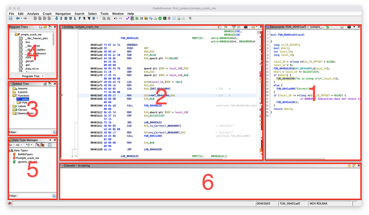 | 6. 콘솔(Console) | Ghidra 스크립트의 실행 결과가 출력되는 창이다. 스크립팅 기능을 이용하면 많은 시간이 걸리는 리버스 엔지니어링 작업을 자동화할 수 있다. |