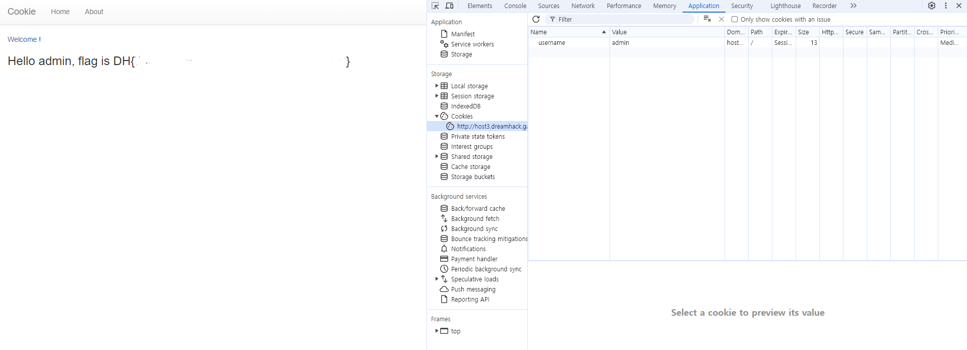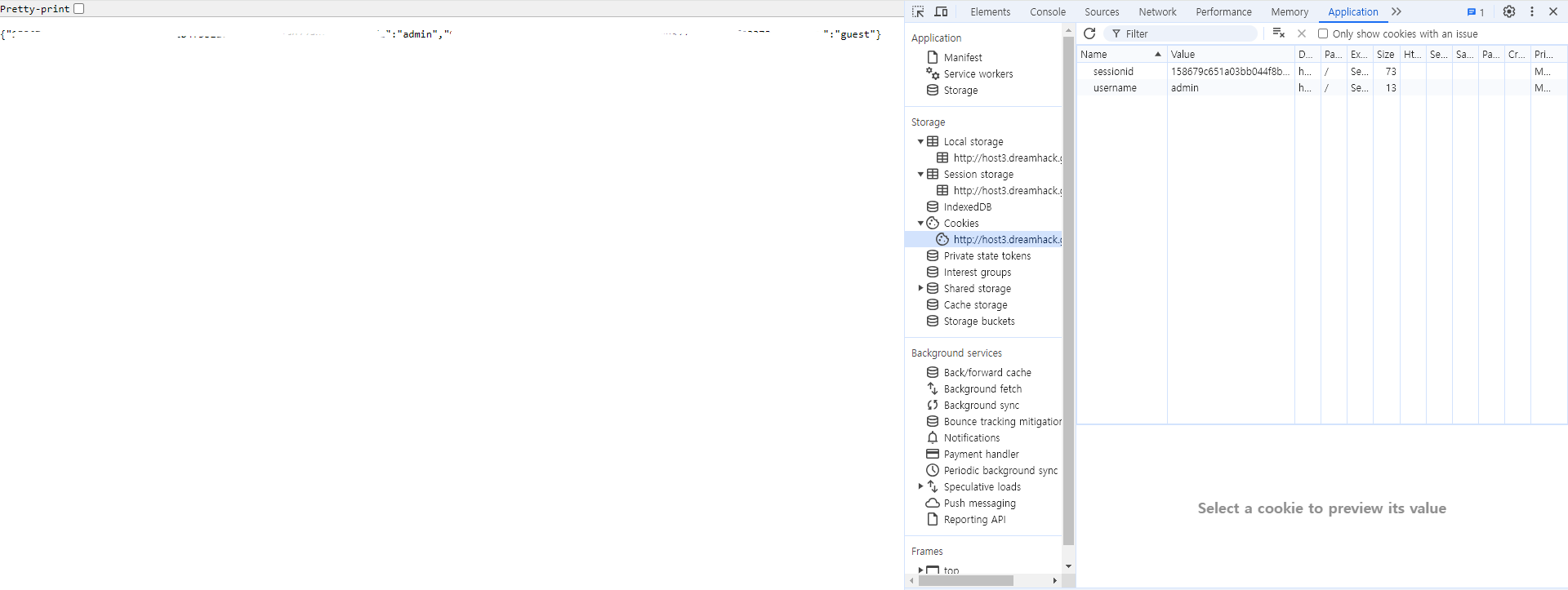 ▶ guest/guest로 로그인 후, cookie의 username 값을 조작한 후 새로고침.