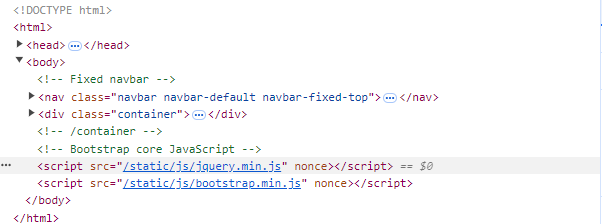 ㄴ CSP 정책 중 script와 관련된 정책을 살펴보면 nonce 속성을 필요로 하며, 같은 출처 내의 파일만을 script의 src로 올 수 있도록 출처를 self 로 제한하고 있다.