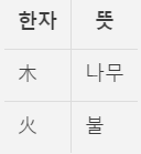 | 한자 | 뜻 | |-------|-------| | 木 | 나무 | | 火 | 불 | |