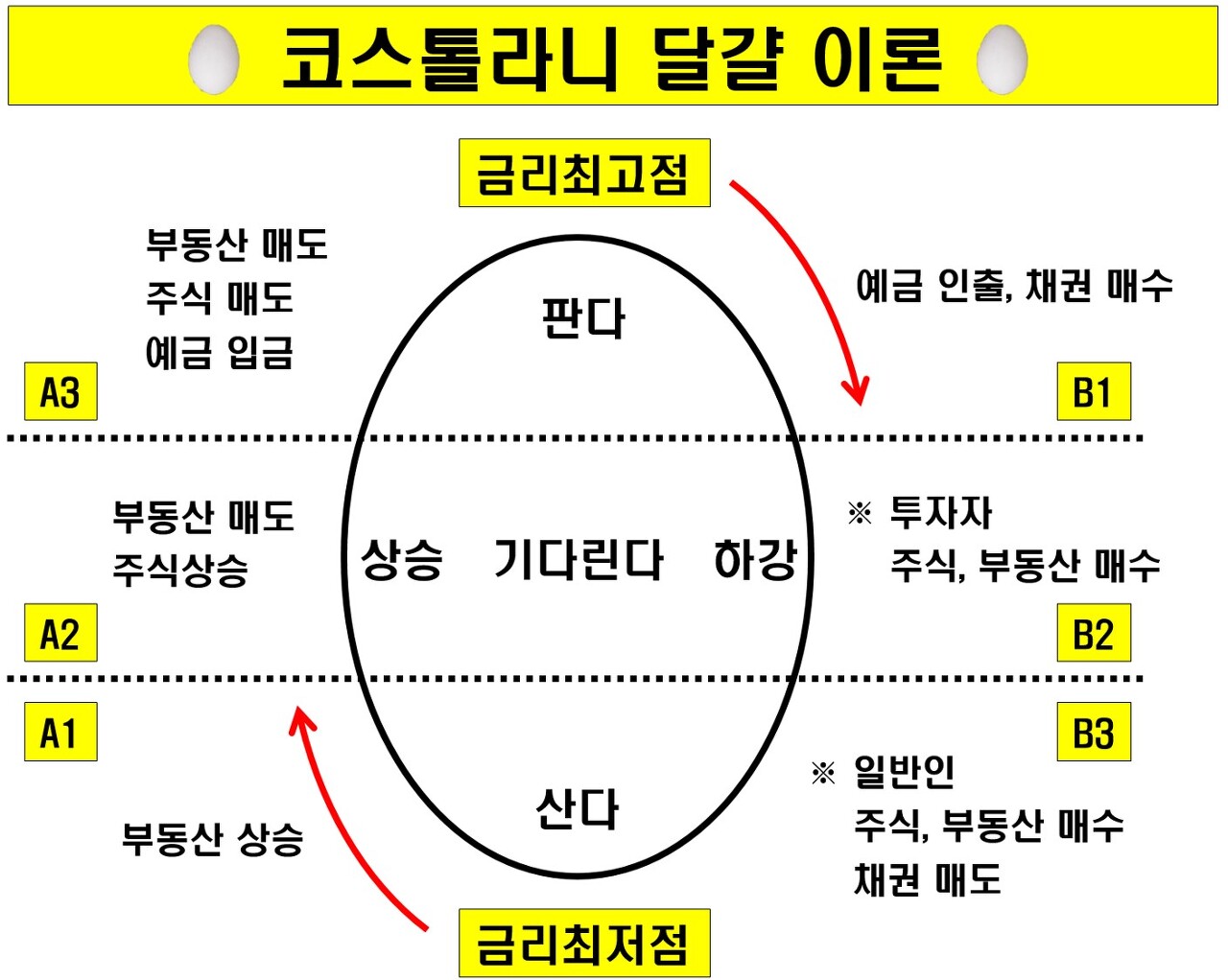 - 유럽 증권계의 ‘위대한 유산’이라고 불린 투자자 앙드레 코스톨라니(1906~1999)는 주가의 순환주기를 여섯 국면으로 나눠 그림으로 표시했다. 이는 ‘코스톨라니의 달걀’이라고 불린다.
